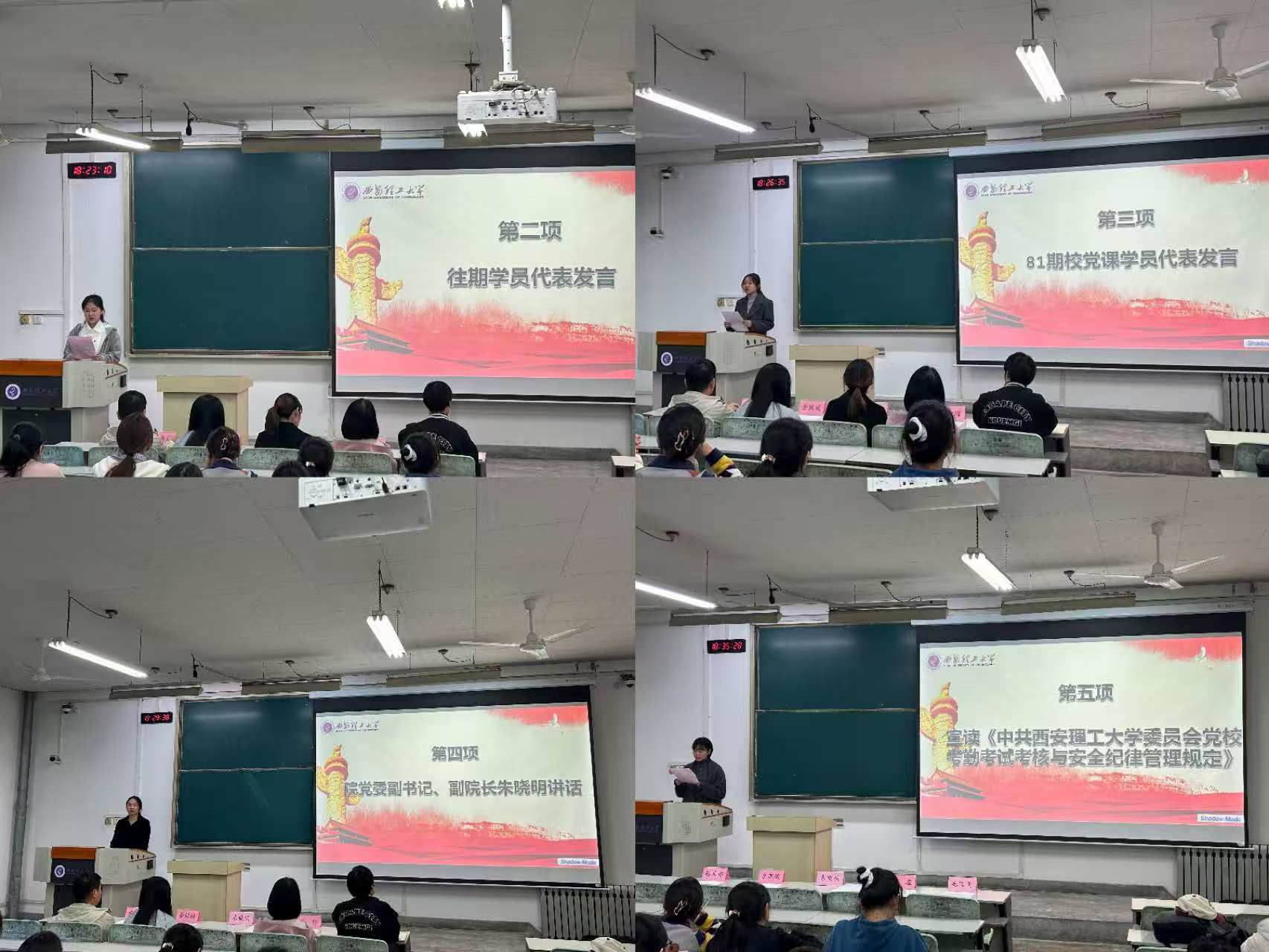 开班仪式在庄严的国歌声中拉开帷幕。会议伊始,第80期入党积极分子培训班优秀学员王佳璇代表往期优秀学员发言,她结合自身学习经历,从理论学习、小班研讨、实践活动三个方面分享了党校学习的收获并反思了自己的不足。她提到:“我们的初心使命要体现在日常学习中攻坚克难、在集体生活中团结协作、在社会服务中主动担当”。随后,第81期入党积极分子培训班学员代表张钰焓发言,她表示将以饱满的热情投入党课学习,严守纪律、勤学善思,努力将理论知识转化为实际行动,争取早日成为一名光荣的共产党员。接着,分党校负责人黄博琳宣读了《中共西安理工大学委员会党校考勤考试考核与安全纪律管理规定》,重点强调了课堂纪律、考核标准及安全要求,引导学员树立规矩意识,为后续学习奠定坚实基础。最后学院党委副书记兼副院长朱晓明老师做开班讲话,朱老师提到党课是青年学生坚定理想信念、提升思想觉悟、筑牢信仰之基的重要课堂,更是深入了解党的历史、党的理论、党的宗旨,进而向党组织靠拢的关键一步,希望全体学员:一要心怀敬畏,端正学习态度;二要深学细悟,筑牢思想根基;三要行合一,勇担时代使命。开班仪式结束后,全体学员共同观看了专题节目《榜样9》,片中展现的优秀共产党员事迹深深触动了在场学生,大家纷纷表示将以榜样为标杆,汲取奋进力量,在未来的学习生活中践行初心使命。