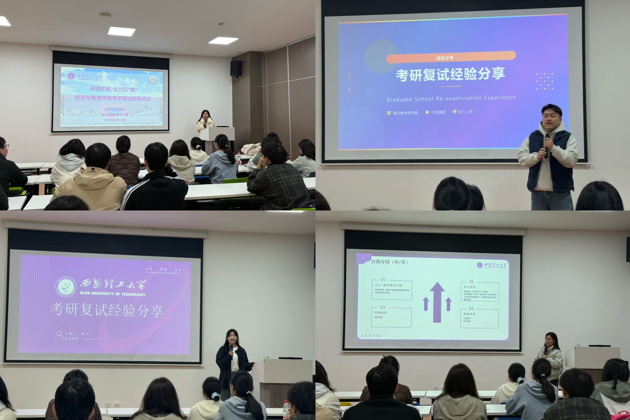 在经验分享环节,任凯、杜雨彤、崔灿三位优秀研究生依次登台,他们结合自身备考与复试实战经历,围绕复试流程拆解、专业课备考技巧、综合面试应答策略、英语口语提升、复试礼仪规范等核心内容,展开细致全面的分享,针对复试高频问题、易错细节给出实用建议,为在场学子理清备考思路、明晰复习方向。