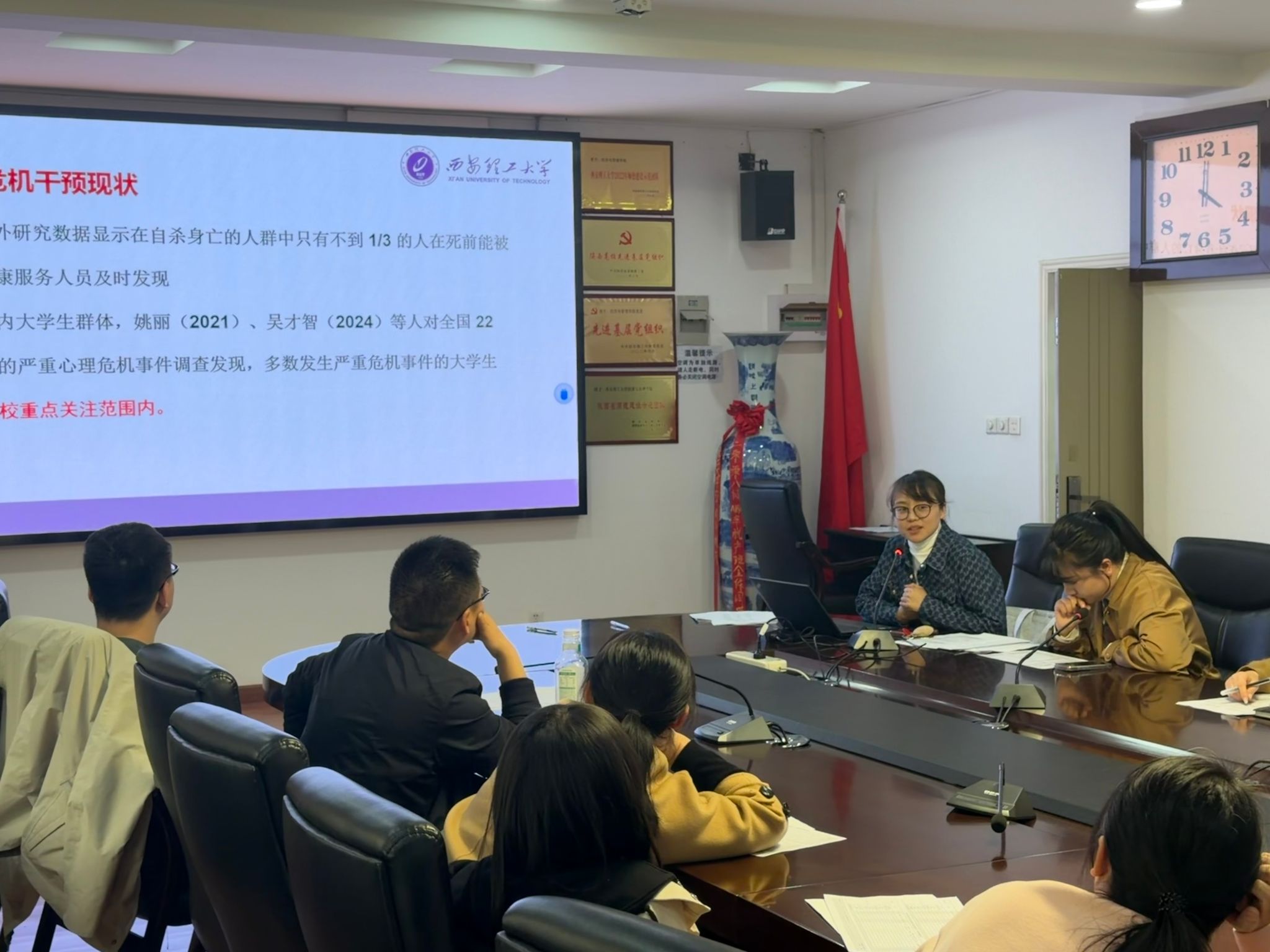 培训现场,冯娟老师结合高校学生心理工作实际,重点聚焦大学生隐性心理危机的识别技巧,通过个体因素、环境因素、隐匿性特征以及核心风险指标等方面,结合真实案例剖析,详细解读了隐性心理危机的表现形式、隐藏特征,引导导师们学会从学生的情绪波动、行为变化、人际关系等细微之处捕捉心理异常信号。培训过程中,导师们认真聆听、详细记录,积极参与互动交流,结合自身工作中遇到的学生心理问题与冯娟老师深入探讨。此次培训内容翔实、针对性强,既有理论指导,又有实践借鉴,有效破解了导师们在隐性心理危机识别与干预中的困惑,进一步强化了全体导师的心理安全责任意识。