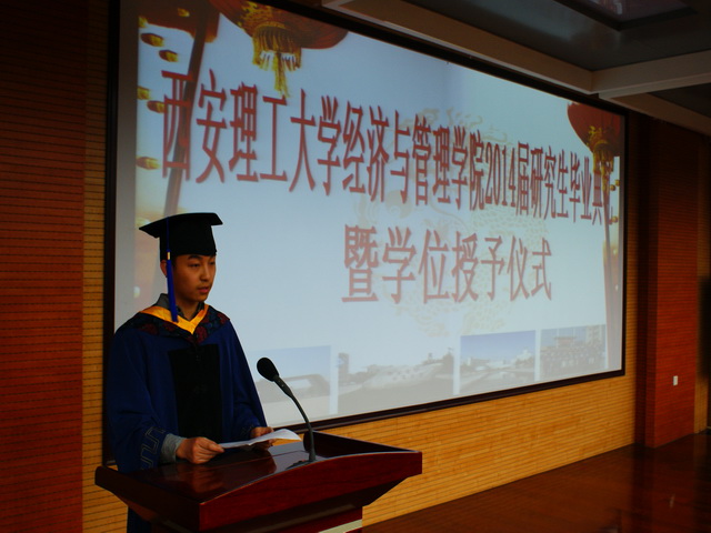 2014年4月15日,经济与管理学院在教学十一楼EMBA报告厅隆重举行2014届硕士毕业生毕业典礼暨学位授予仪式,经济与管理学院院长扈文秀、党委书记王青耀、副书记兼副院长宗娜、财会与金融系主任王文莉、学工办主任赵玉强、研究生秘书王鸿奇参加了典礼,典礼由学院研究生工作负责人杨屹主持。