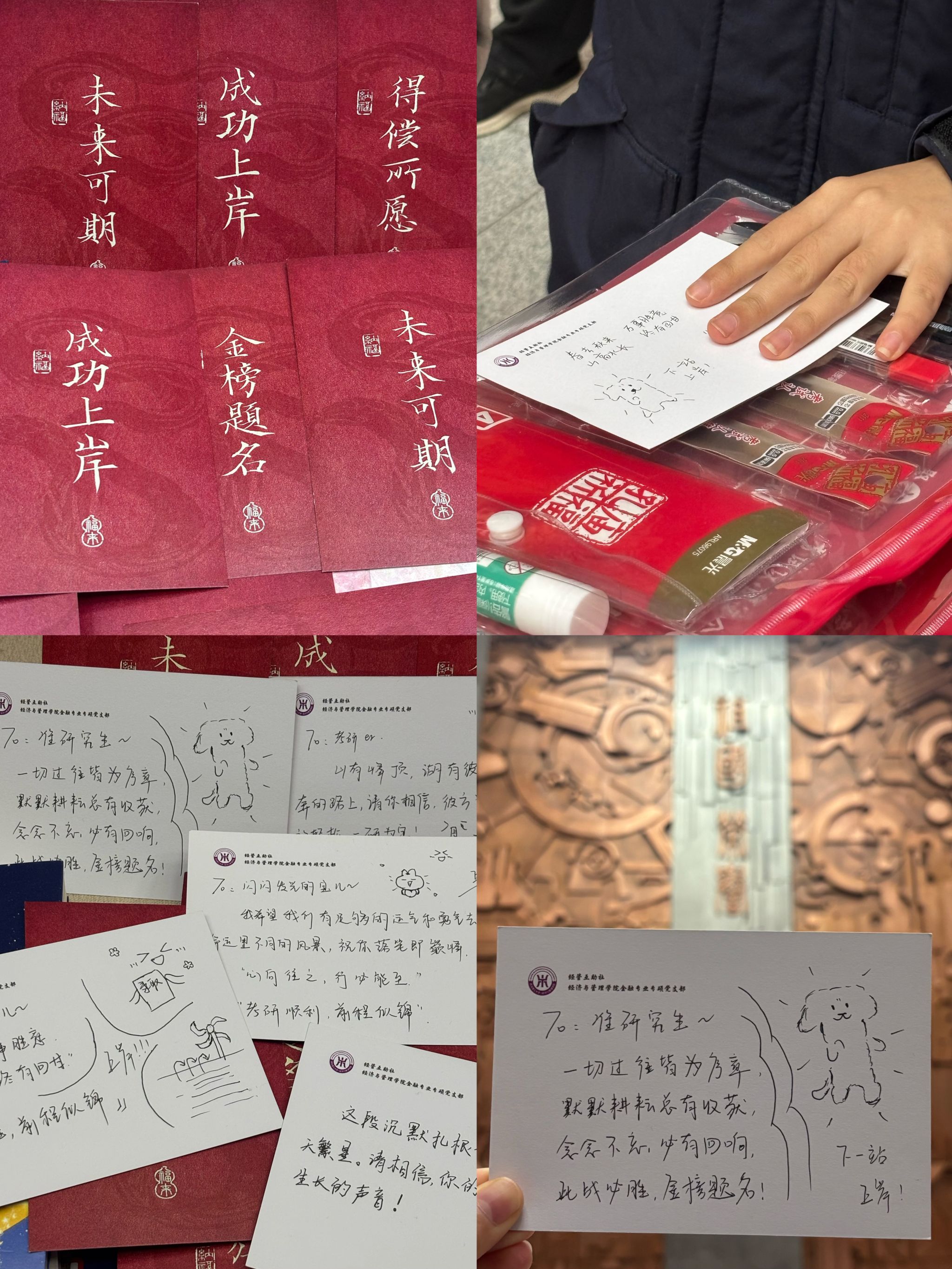 活动现场,朱晓明对学子们提出殷切期望:“考研冲刺阶段是意志与耐力的终极考验,希望同学们坚守初心、锚定目标,以全力以赴的姿态攻坚克难,用不懈奋斗书写青春答卷。”余佩媛从备考保障层面作出细致叮嘱,提醒学子们在高强度复习中注重劳逸结合,科学规划作息时间,做好防寒保暖与心态调适,以饱满精力、从容心态迎接考试挑战。随后,梁姝、曹佩豪、苏瑾为学子们逐一发放学院精心挑选的“考研文具加油包”,礼包内配备涂卡铅笔、专用橡皮、考试签字笔、替换笔芯等考场必备文具,精准贴合应试需求;更有学院互助社联合金融专业专硕党支部准备的专属寄语加油明信片,字里行间承载着“旗开得胜、金榜题名”的美好祝愿,这份兼具实用性与纪念意义的祝福,让学子们在寒冬中感受到沉甸甸的关怀。