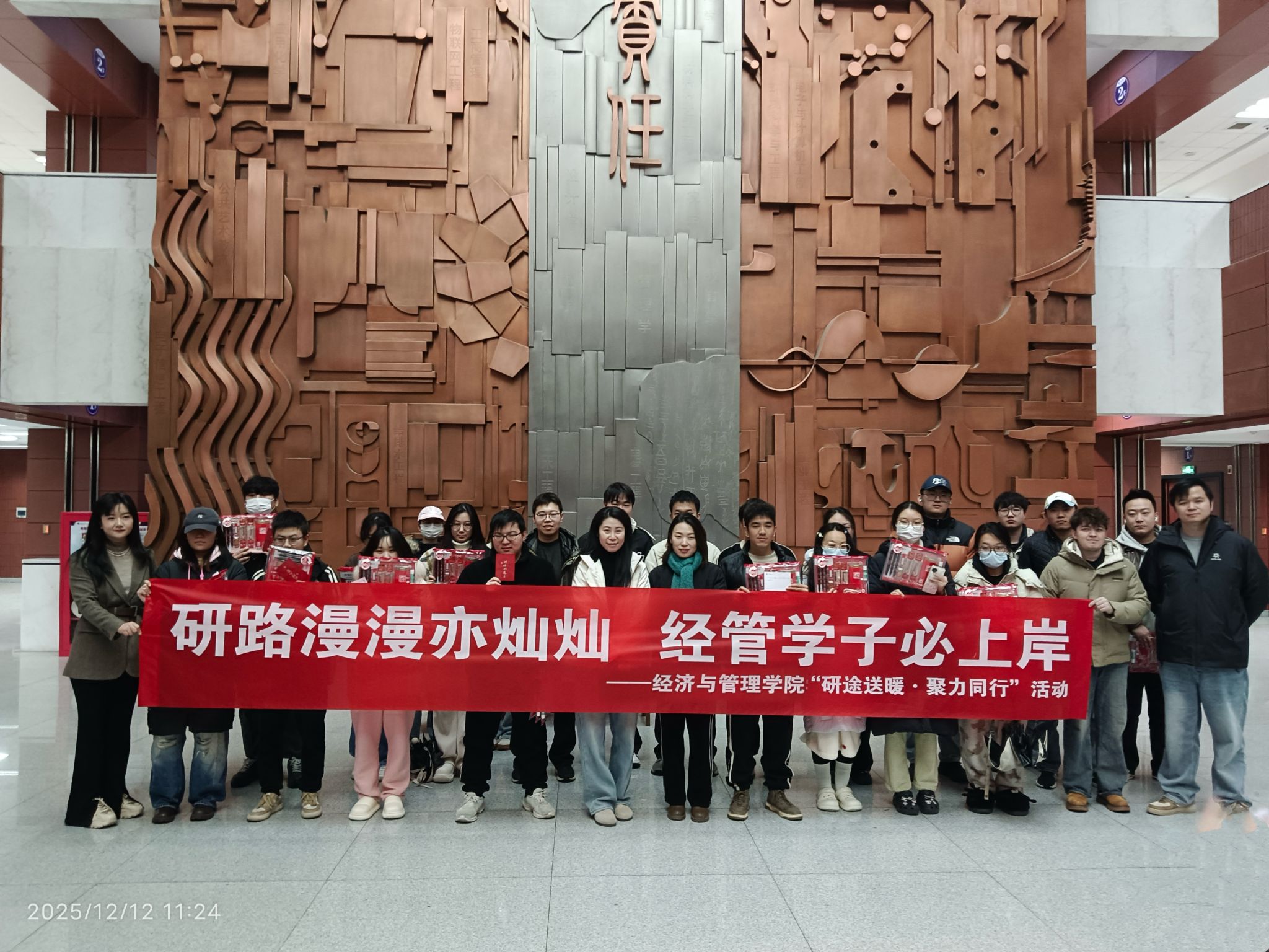 为进一步落实立德树人根本任务,厚植学院优良学风,全方位护航2026届考研学子冲刺备考关键阶段,12月12日中午,经济与管理学院在曲江图书馆开展“研途送暖,聚力同行”考研送温暖活动。学院党委副书记、副院长朱晓明,学工办主任余佩媛,以及2026届毕业班辅导员梁姝、曹佩豪、苏瑾共同参与活动,为奋战在考研一线的学子送上暖心关怀与殷切期许,以务实举措为追梦之路注入坚实力量。